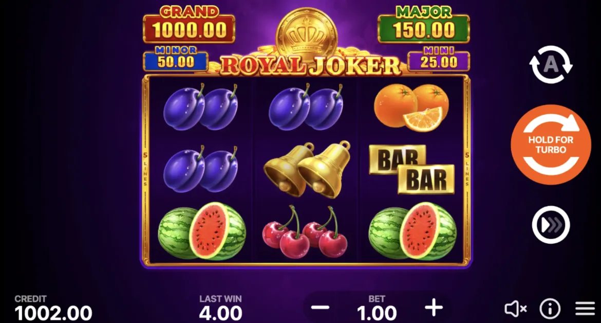 Royal Joker: Hold and Win from Playson is a dynamic online slot that fuses the nostalgic appeal of a traditional fruit machine with contemporary bonus excitement. Featuring a 3x3 layout and 5 fixed paylines, this high-volatility title presents opportunities for rewards reaching 21,150x the bet. It distinguishes itself through captivating features like respins, multiplier wilds, and a progressive jackpot ladder, delivering substantial thrills within a clean, accessible design. Enhanced by vivid graphics, a retro-inspired aesthetic, and fluid mechanics, Royal Joker: Hold and Win caters to classic slot purists and modern players alike, offering significant payout prospects in an elegantly simple package. This fusion positions it as an attractive option for fans of timeless slots refreshed with innovative elements.